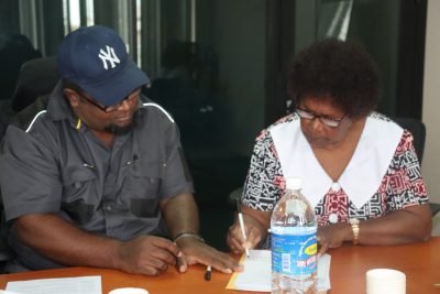 Chief Trustee Gloria Sibisopere sign a lease agreement as closely watch by the Chief Lands Officer Michael Sikiwa’ae.