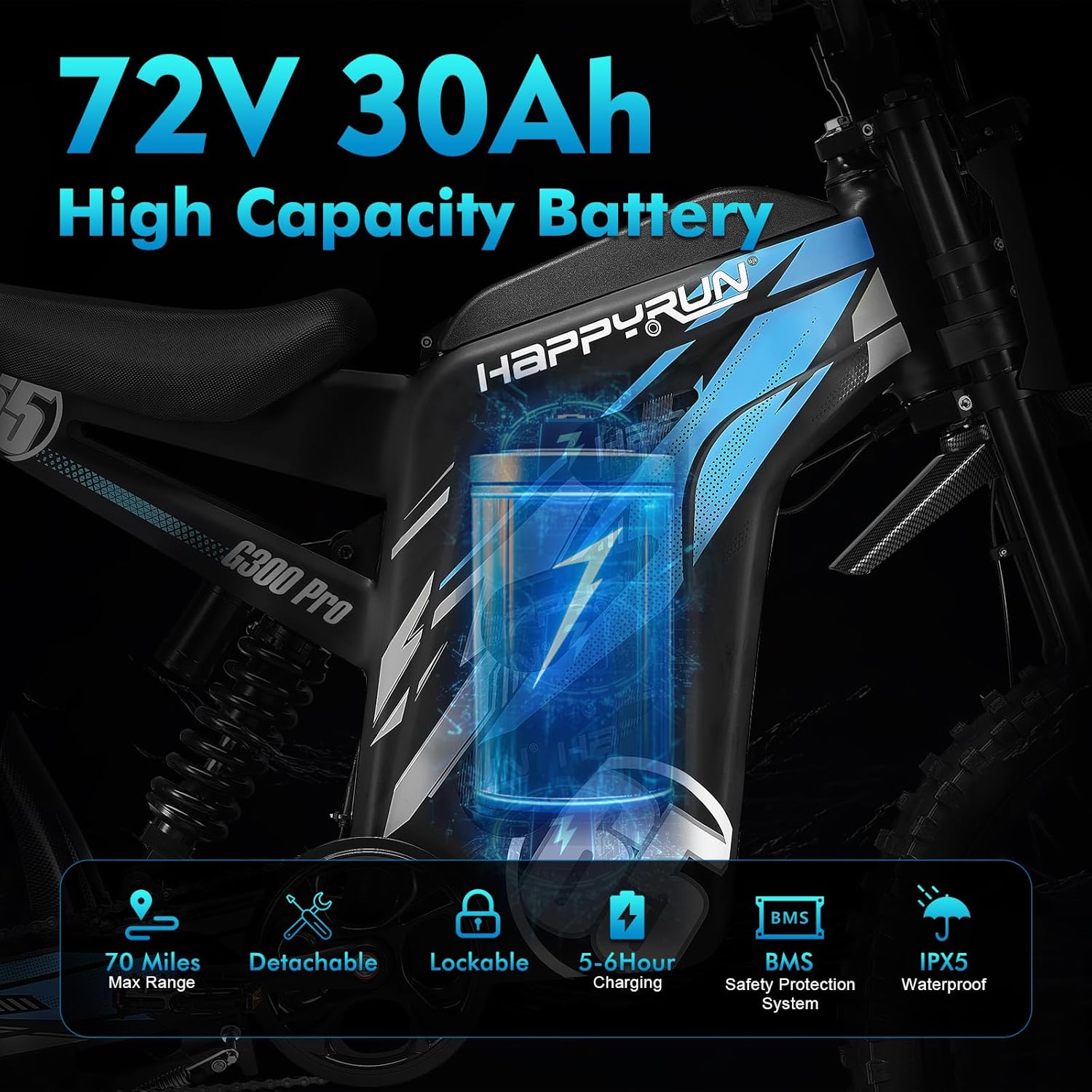Electric Dirt Bike 6500W Peak Motor 72V 30Ah Battery Electric Bike for Adults 50MPH Top Speed 70+ Mile Range Ebike Hydraulic Brakes Electric Motocycle G300pro