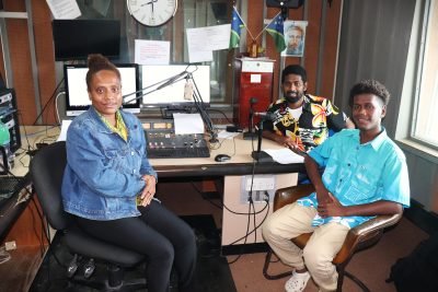 Pasifika Wayfinder Walter Koroa (center) flagged by SIBC Breakfast show hosts Cynthia Seda and Dykesly Hou.